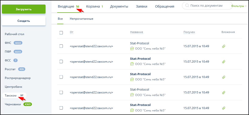 Для приема информационных сообщений от специализированного оператора связи следует войти в систему по ключу ЭП (см.п. 5.1. Доступ по ключу ЭП) и нажать кнопки "Такском" и "Входящие". Пример: