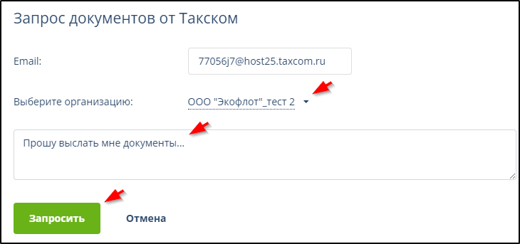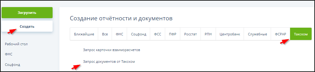 Нажать кнопки "Создать", "Такском", "Запрос документов от Такском":