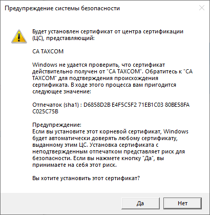 Нажатием кнопки "Да" необходимо подтверждать установку этих сертификатов.