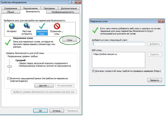 В открывшемся окне "Надежные узлы" в поле "Добавить узел в зону:" (или "Добавить в зону следующий узел:") нужно указать добавляемый адрес https://*.taxcom.ru и нажать кнопку "Добавить". В результате адрес должен отобразиться в поле "Веб-узлы:".