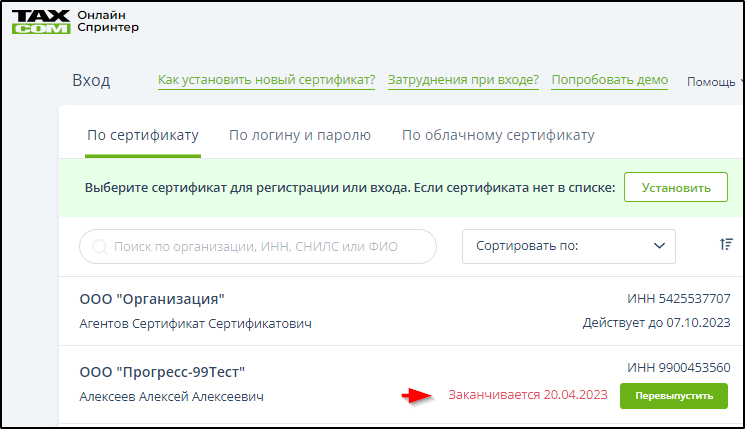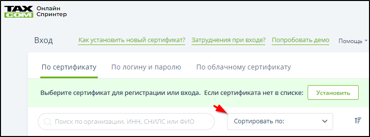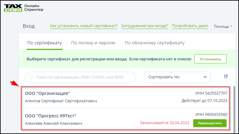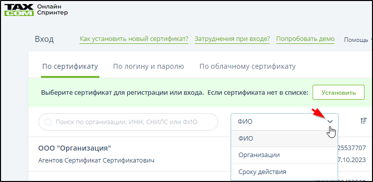 Способ 2. Упорядочить список сертификатов, выбрав в меню "Сортировать по" один из трёх способов упорядочивания (1- по ФИО, 2 - по наименованию организации, 3 - по сроку действия). Пример: