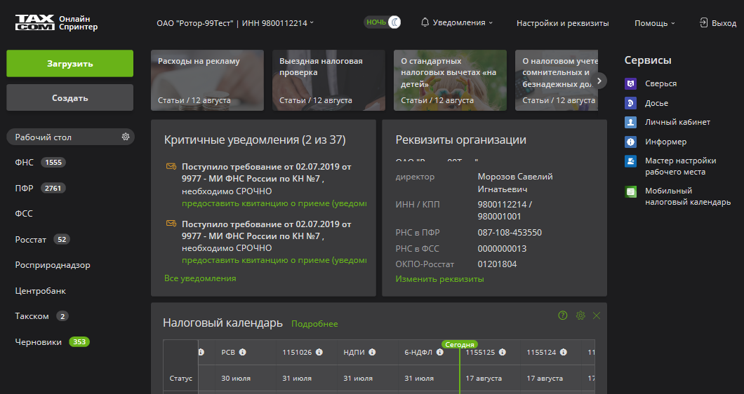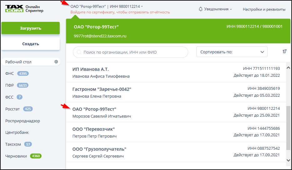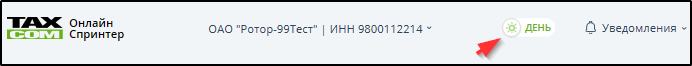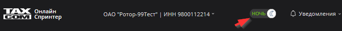 • Нажать кнопку с наименованием и ИНН организации в верхней части страницы.