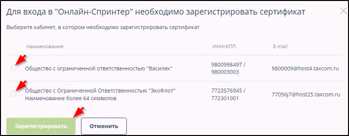 3. После замены ключа ЭП пользователя при первом входе в систему с использованием нового ключа ЭП автоматически произойдёт формирование и отправка заявки на регистрацию нового сертификата ключа ЭП в ФНС.  Для физического лица, имеющего несколько личных кабинетов в системе, при первом входе в систему с использованием нового ключа ЭП откроется окно выбора кабинета, в котором требуется зарегистрировать новый сертификат ключа ЭП. Пример: