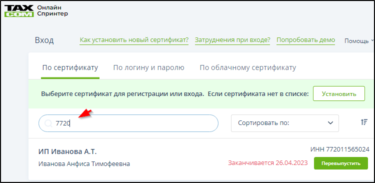Способ 1. Начать вводить в поле поиска наименование организации, её ИНН или ФИО владельца. В результате этого происходит фильтрация сертификатов. Пример:
