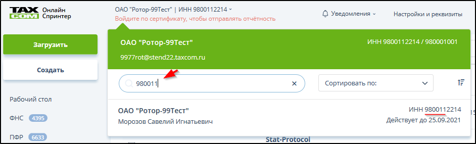 Начать вводить в поле поиска наименование организации, её ИНН или ФИО владельца. Автоматически сработает отбор по введенному параметру. Пример: