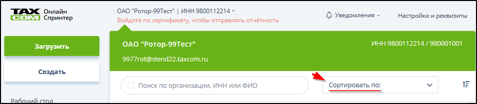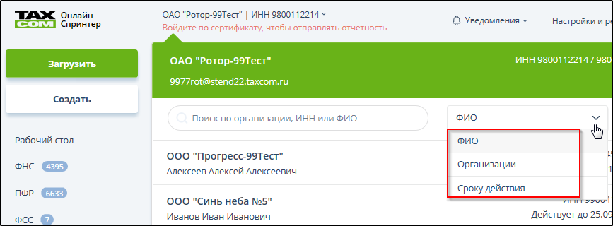 Упорядочить список сертификатов, выбрав в меню "Сортировать по" один из трёх способов упорядочивания (по ФИО, по наименованию организации, по сроку действия). Пример: