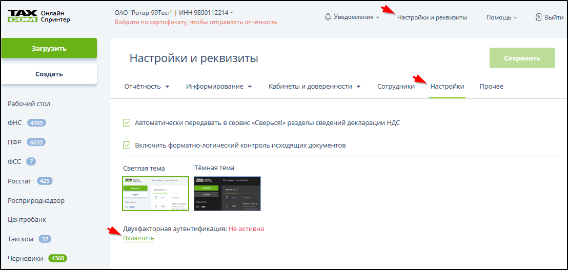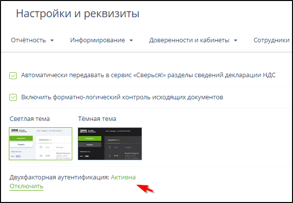 В подразделе "Настройки и реквизиты" - "Настройки" отображается надпись "Двухфакторная аутентификация: Активна". Пример: