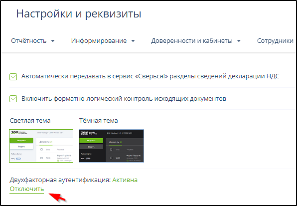 Двухфакторную аутентификацию при входе по логину и паролю можно отключить. Для этого нужно в подразделе "Настройки и реквизиты" - "Настройки" в позиции "Двухфакторная аутентификация" нажать ссылку "Отключить".Пример: