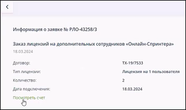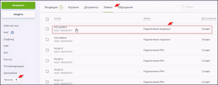 Заявки на предоставление услуг и соответствующие счета отображаются на вкладке "Заявки" раздела "Такском". Пример: