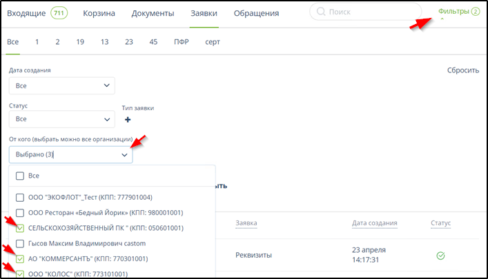 Заявки по присоединенным кабинетам можно найти только с использованием фильтра.