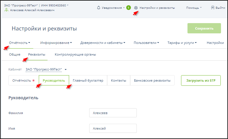 Заполнение сведений о руководителе и главном бухгалтере организации производится в разделе "Настройки и реквизиты" - "Отчётность" - "Реквизиты". Пример: