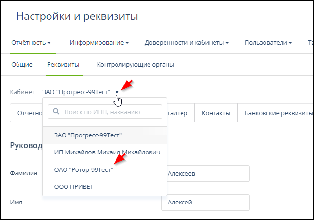 2. Если у вас несколько кабинетов в системе - нажать кнопку и выбрать в открывшемся списке кабинет (организацию, филиал, отделение). Пример: