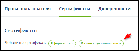 Нажать кнопку "Из списка установленных" или "В формате .cer" для импорта сертификата своего ключа ЭП. Пример:
