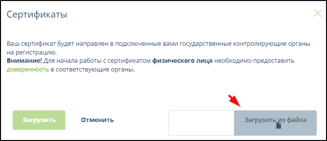 В случае выбора сертификата "В формате .cer" - нажать кнопку "Загрузить из файла". Пример: