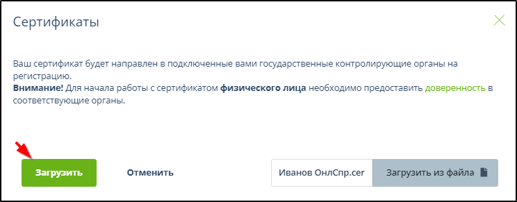 В случае выбора сертификата "Из списка установленных" - отметить необходимый сертификат галочкой и нажать кнопку "Загрузить". Пример: