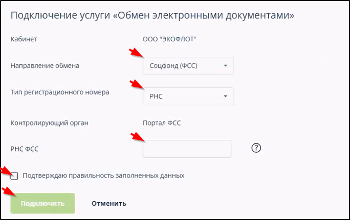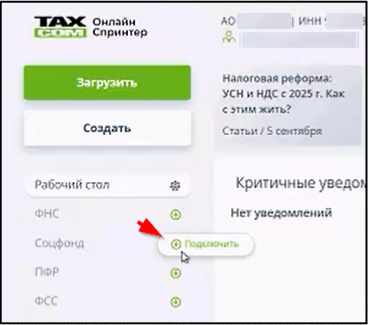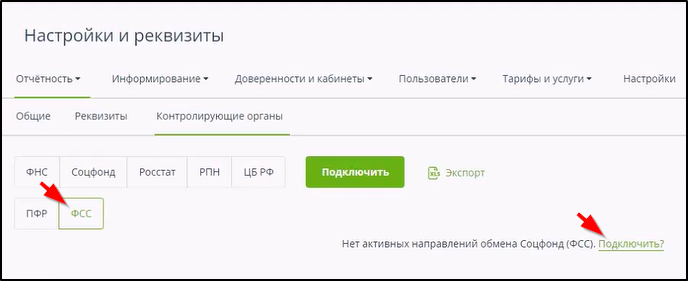 Для формирования заявки на подключение нового направления обмена используется кнопка "Подключить" в подразделе "Настройки и реквизиты" - "Отчётность" - "Контролирующие органы" или кнопка в главном меню. Пример отображения выделенной кнопки подключения направления обмена с Соцфондом: