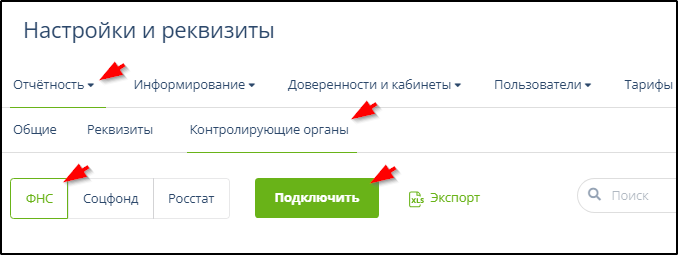 Пред тем, как воспользоваться кнопкой "Подключить" в подразделе "Настройки и реквизиты" - "Отчётность" - "Контролирующие органы", нужно нажатием выбрать контролирующий орган. Примеры: