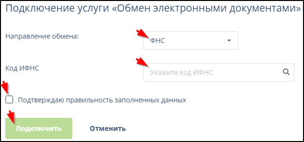 После ввода информации о подключаемом направлении обмена необходимо поставить галочку в позиции "Подтверждаю правильность заполненных данных" и нажать кнопку Подключить . Сразу после этого на вкладке "Контролирующие органы" подключаемые направления обмена получают статус "В процессе подключения", а заявка на их отключение на вкладке "Такском" - "Заявки" - статус "В процессе".