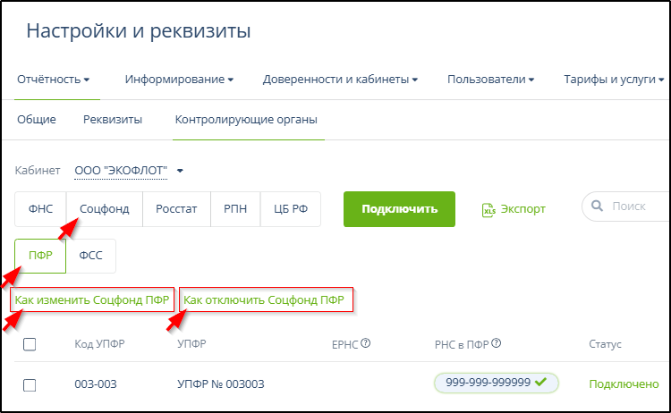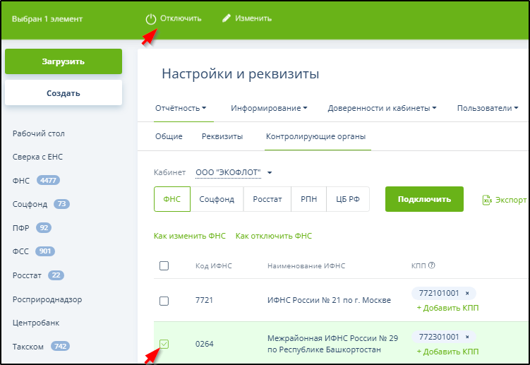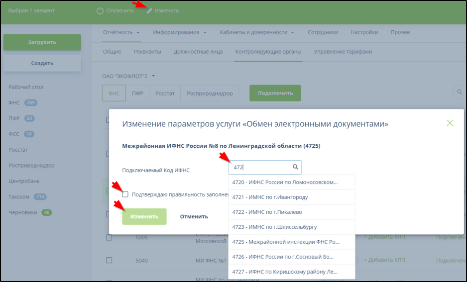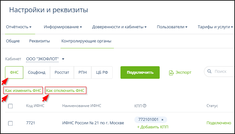 Инструкции по изменению и отключению направлений обмена доступны по ссылкам "Как изменить ..." и "Как отключить ..." на вкладках направлений обмена. Например, на вкладке "ФНС":