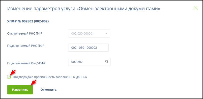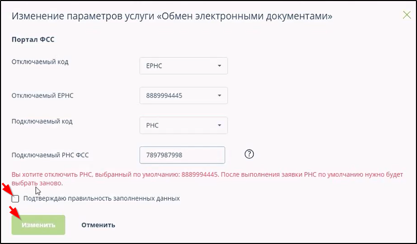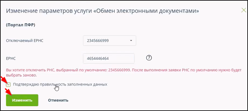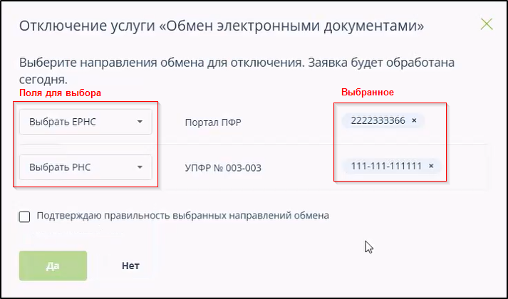 При отключении направления обмена обмена с ПФР необходимо в следующем окне указать ЕРНС и/или РНС. Пример:
