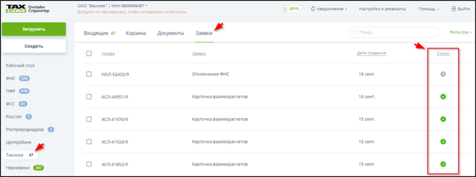 Пример отображения состояния выполнения заявок на вкладке "Такском" - "Заявки":