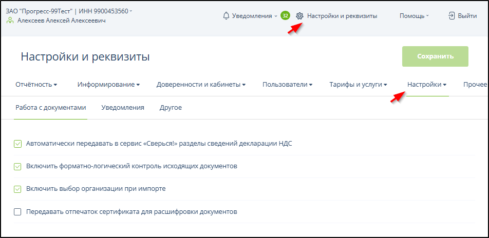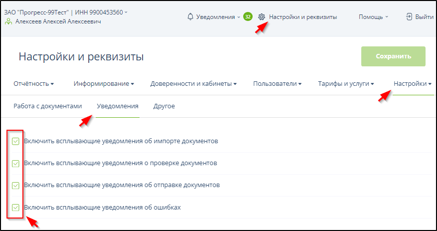 всплывающих уведомлений об импорте документов, о проверке документов, об отправке документов, об ошибках;
