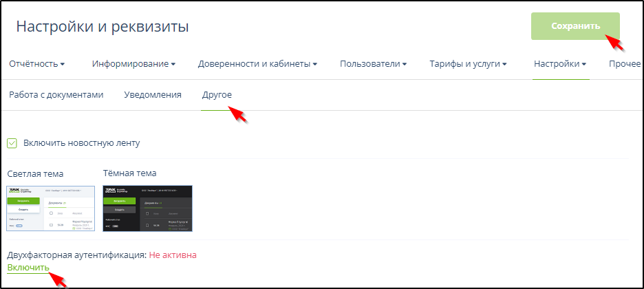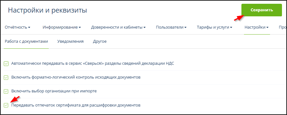 Галочка в позиции "Передавать отпечаток сертификата для расшифровки документов" позволит ускорить расшифровку документов после замены ключа ЭП. Эта настройка действует для всех пользователей кабинета. После установки галочки (щелчком левой кнопкой мыши) нужно нажать кнопку :