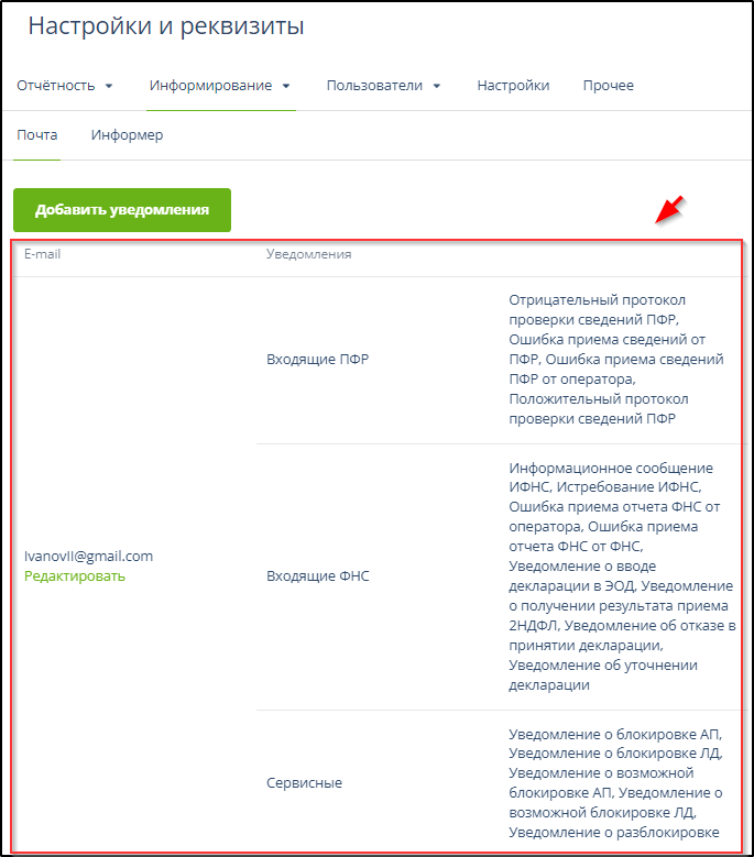 Кнопка "Редактировать" в левой графе этой таблицы предназначена для редактирования состава уведомлений путём добавления и удаления галочек в соответствующих позициях.