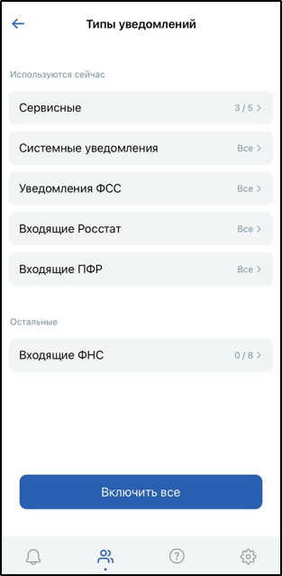 Далее можно проверить и отредактировать настройки уведомлений, переходя по ссылкам разделов уведомлений ("Сервисные", "Входящие ФНС", "Входящие Росстат", ...). Пример: