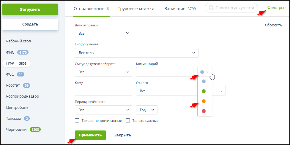 • Открыть параметры фильтрации нажатием кнопки "Фильтры" справа над списком документов.