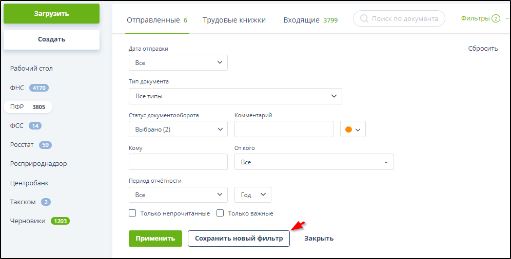 Настройками фильтрации можно воспользоваться без их сохранения или сохранить их с формированием новой закладки (папки документов) с произвольным названием.