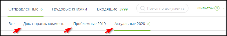 После нажатия кнопки "Сохранить" сформируется постоянная закладка для результатов применения сохраненных настроек фильтра. Ссылку на эту закладку можно добавить в главное меню (см. п. 13). Пример с тремя сформированными пользователем закладками фильтров "Док. с оранж. коммент.", "Проблемные 2019" и "Актуальные 2020":