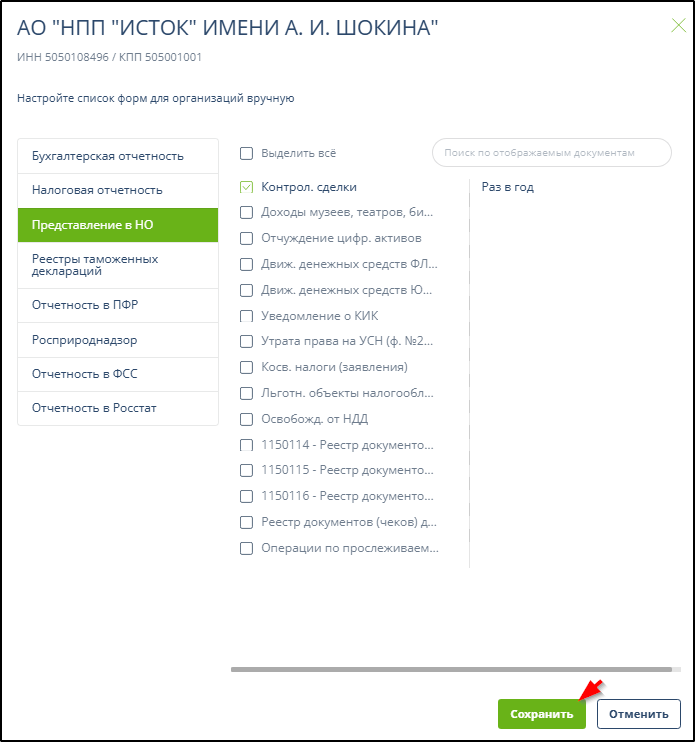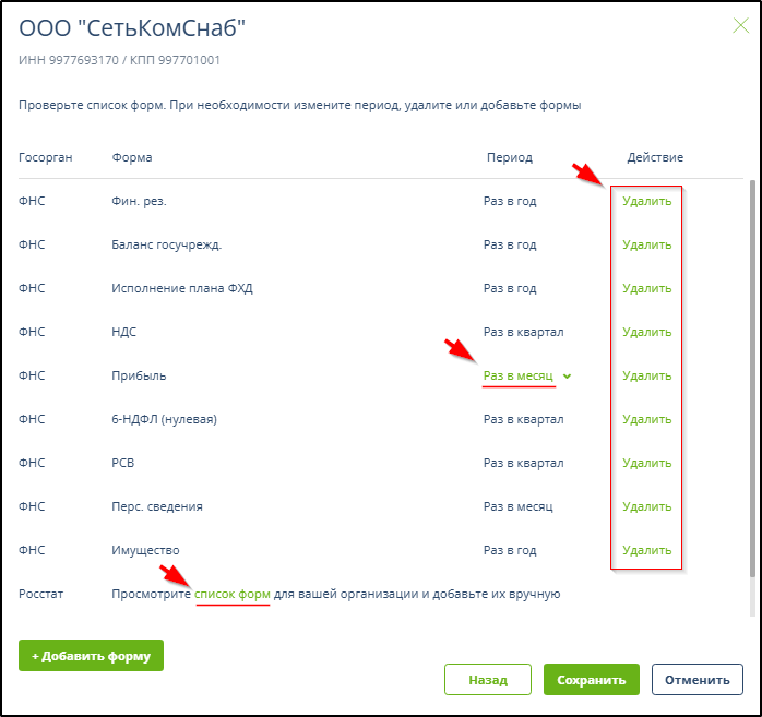 Если нужно добавить определённые формы отчётности, то нужно нажать кнопку .