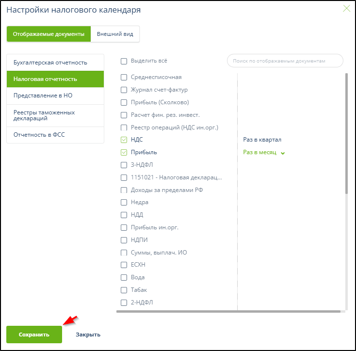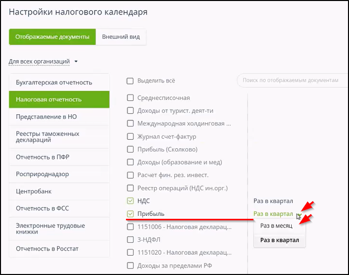 Настройка состава напоминаний налогового календаря и состава списка бланков отчётности