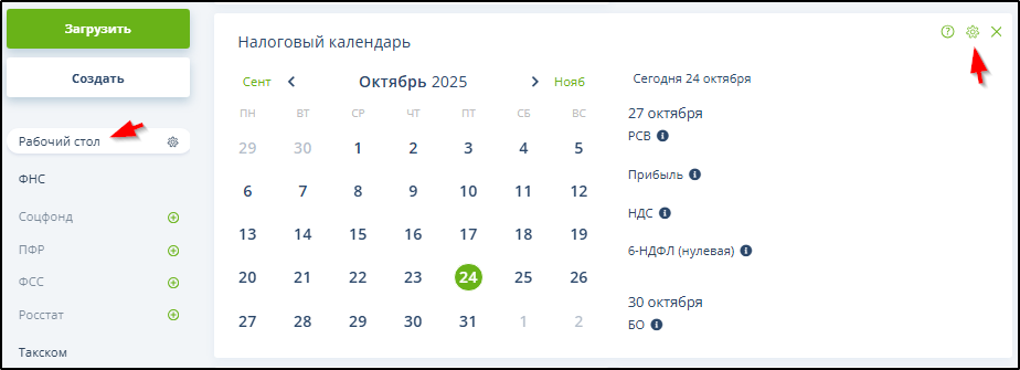Нажать кнопку или на виджете налогового календаря в разделе "Рабочий стол":