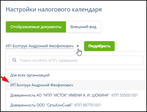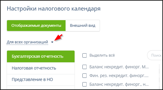 Если кабинетов или доверенностей несколько, - выбрать для настройки календаря кабинет или доверенность в списке, раскрывающемся после нажатия кнопки "Для всех организаций". Пример: