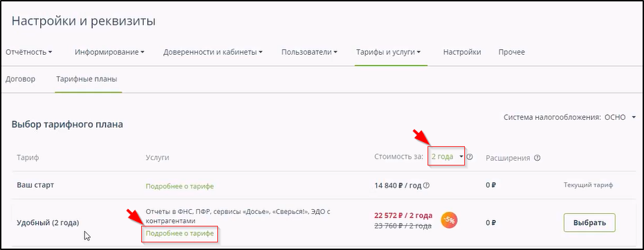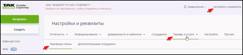 Этот способ также приводит в подраздел "Настройки и реквизиты" - "Тарифы и услуги" - "Тарифные планы".