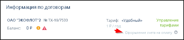 8. Дождаться счёта на оплату нового тарифа. Пока счёт формируется на виджете "Информация по договору" ("Информация по договорам") и в подразделе "Настройки и реквизиты" - "Тарифы и услуги" - "Тарифные планы" отображается надпись "Оформление счёта на оплату". Примеры: