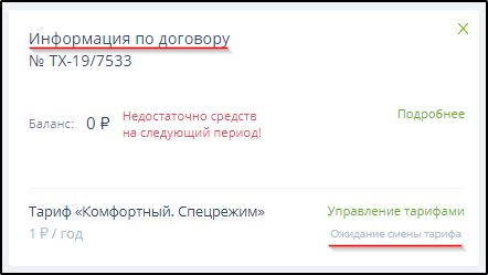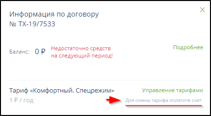 Через 10-15 минут тариф будет изменён, что также можно будет увидеть на виджете "Информация по договору". Пример:
