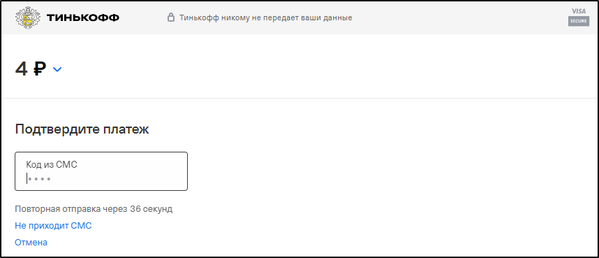 Получить, ввести, отправить код подтверждения оплаты. Пример: