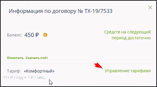 Нажатием кнопок "Рабочий стол" и "Управление тарифами" (на виджете "Информация по договору"). Пример: