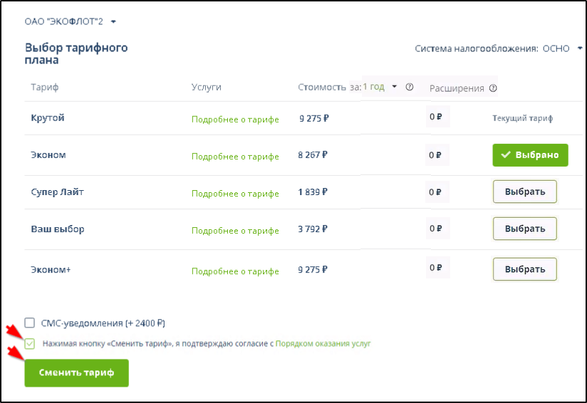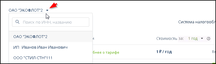 2. В случае объединенного кабинета для нескольких организаций или ИП, - проверить правильность выбора организации или ИП над списком тарифов, при необходимости - изменить. Пример: