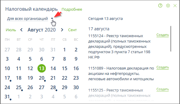 1. В виде традиционного календаря, справа от которого отображается список отчетности с ближайшими сроками сдачи от выбранной даты для выбранной организации (если предусмотрена сдача отчетности нескольких организаций, индивидуальных предпринимателей или филиалов). Отчетность с прошедшим сроком сдачи не отображается.