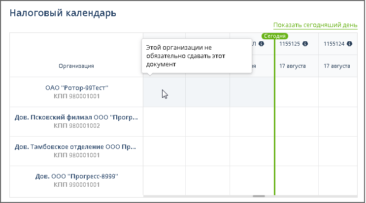 Пример отображения состояния сдачи отчетности по организациям, филиалам, кабинетам налогового представителя: