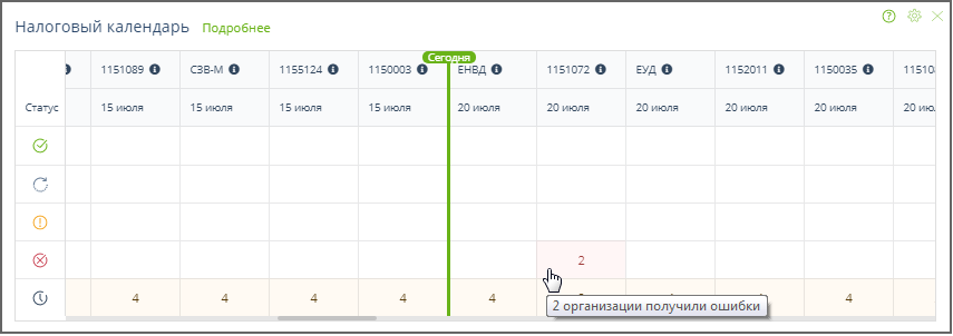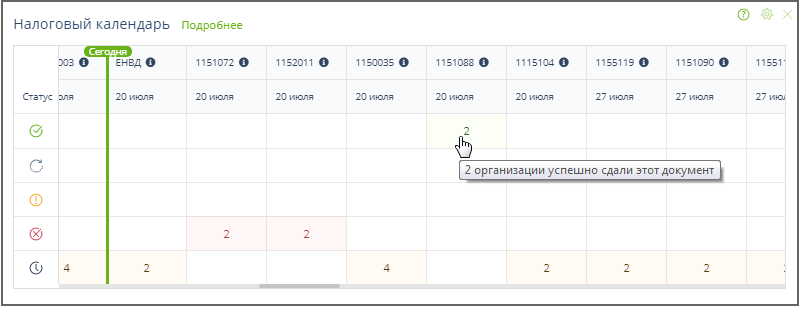 В этой форме представления налогового календаря зеленой линией отмечена текущая дата, за ней (правее) расположены колонки, в которых отображается состояние сдачи отчётности, представляемой контролирующим органам с использованием ПО Онлайн-Спринтер, для которой срок сдачи не прошёл. Левее зеленой линии отображается состояние отчетности, срок сдачи которой прошёл. Примеры: