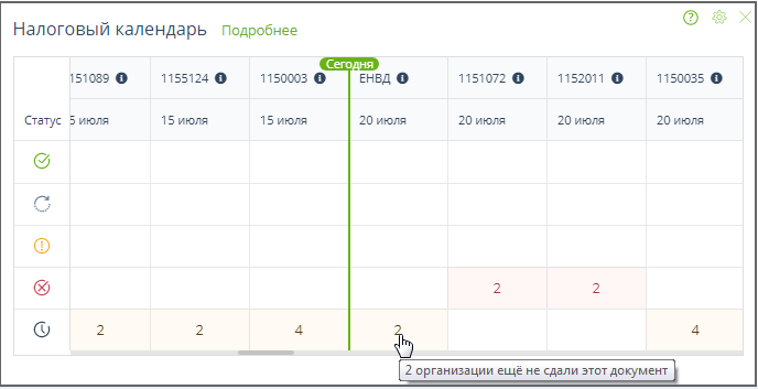 Для перехода к отображению состояния сдачи отчетности по организациям, филиалам, кабинетам налогового или уполномоченного представителя нужно нажать кнопку "Подробнее".