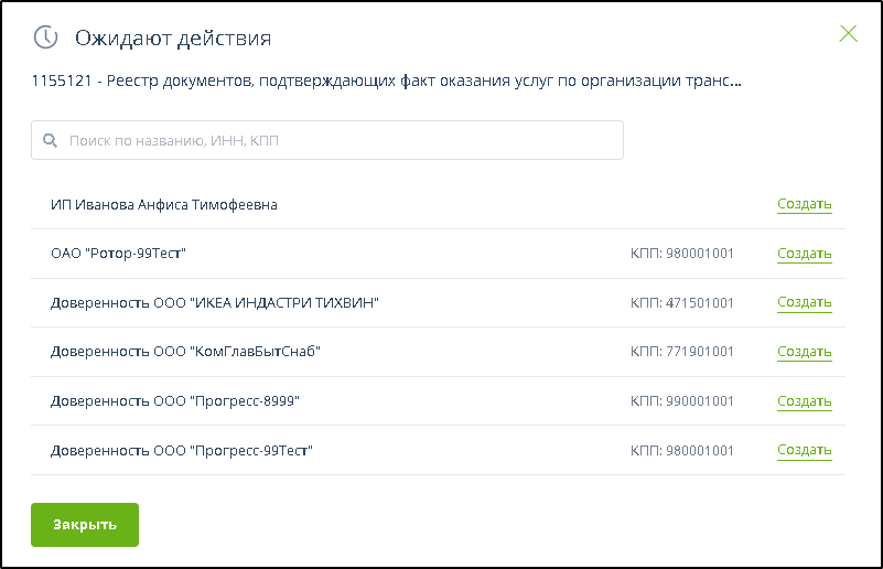 При щелчке мышью на ячейке этой таблицы отображается список кабинетов и доверенностей с ссылками "создать" для перехода к формированию документов отчётности путём заполнения электронных бланков. Примеры: