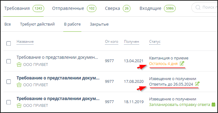 Информацию о требовании можно дополнить планируемой датой отправки ответа, тогда в списках требований на страницах подразделов "Требования" - "Все" и "Требования" - "В работе" будет отображаться напоминание о запланированном сроке. Пример отображения таких напоминаний: