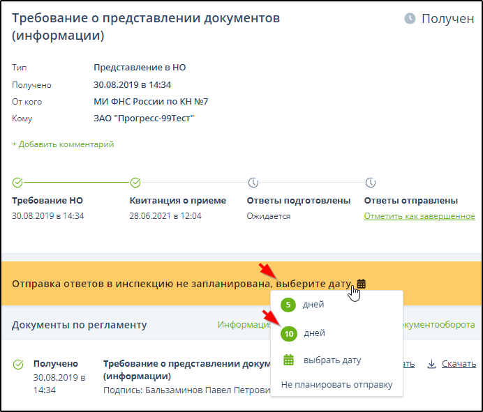 В открывшемся меню выбрать срок или дату. Пример с выбором срока "10 дней":