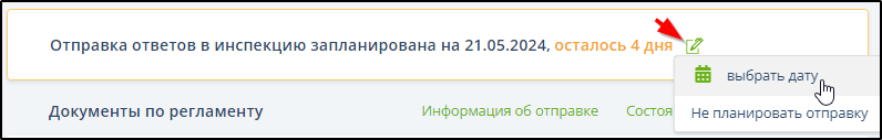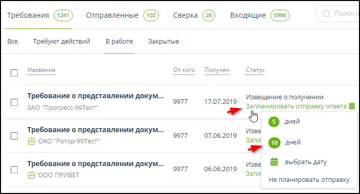 Ввести планируемую дату отправки ответа на требование можно на страницах подразделов "Требования" - "Все", "Требования" - "В работе" и на странице информации о требовании.